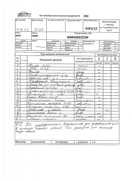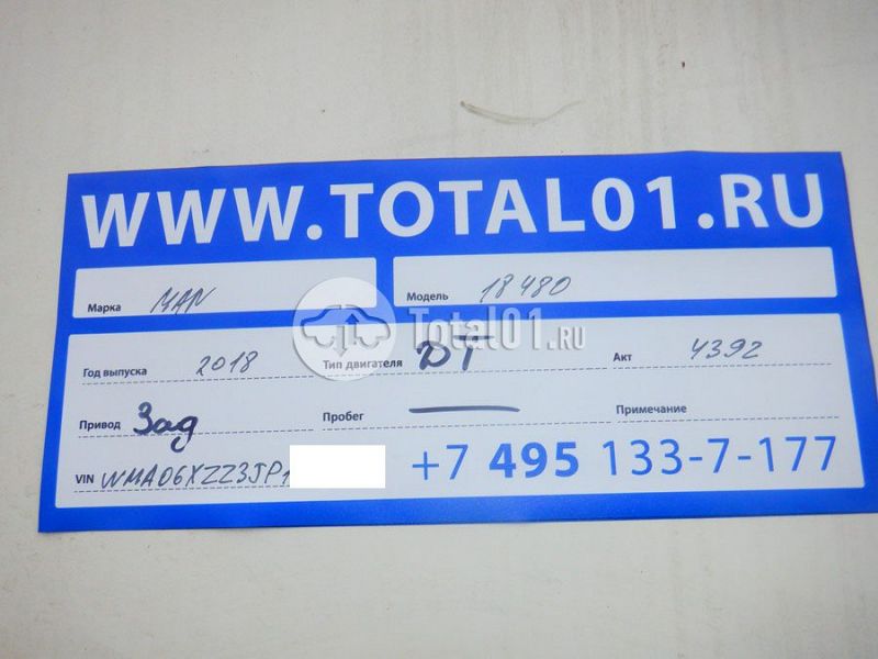 MAN 18.480 4X2 BLS. ПТС: Не передан (выдана справка). Вин номер предоставляется по запросу,направленному на адрес man4@total01.ru. Стоянка: ул.Стандартная, д.6, стр.17. Счет выставляется автомагазином ООО «Блицкар». (Сумма НДС будет указана в счет фактуре). Авто после ДТП, возможны скрытые повреждения. Гарантии юридической чистоты. Запчасти с авто отдельно не продаются. Цены по телефону не обсуждаются. ДКП и ПТС(если не изъят в ГИБДД) находятся в Москве. Возможности отправки документов нет. Для получения ДКП и ПТС(если не изъят в ГИБДД) потребуется ваше личное присутствие или нотариальная доверенность на вашего представителя. Правый передний удар; левый бок; рама; возможны скрытые повреждения. Ранее автомобиль находился в собственности юр.лица. Количество владельцев: н/у. Пробег н/у.