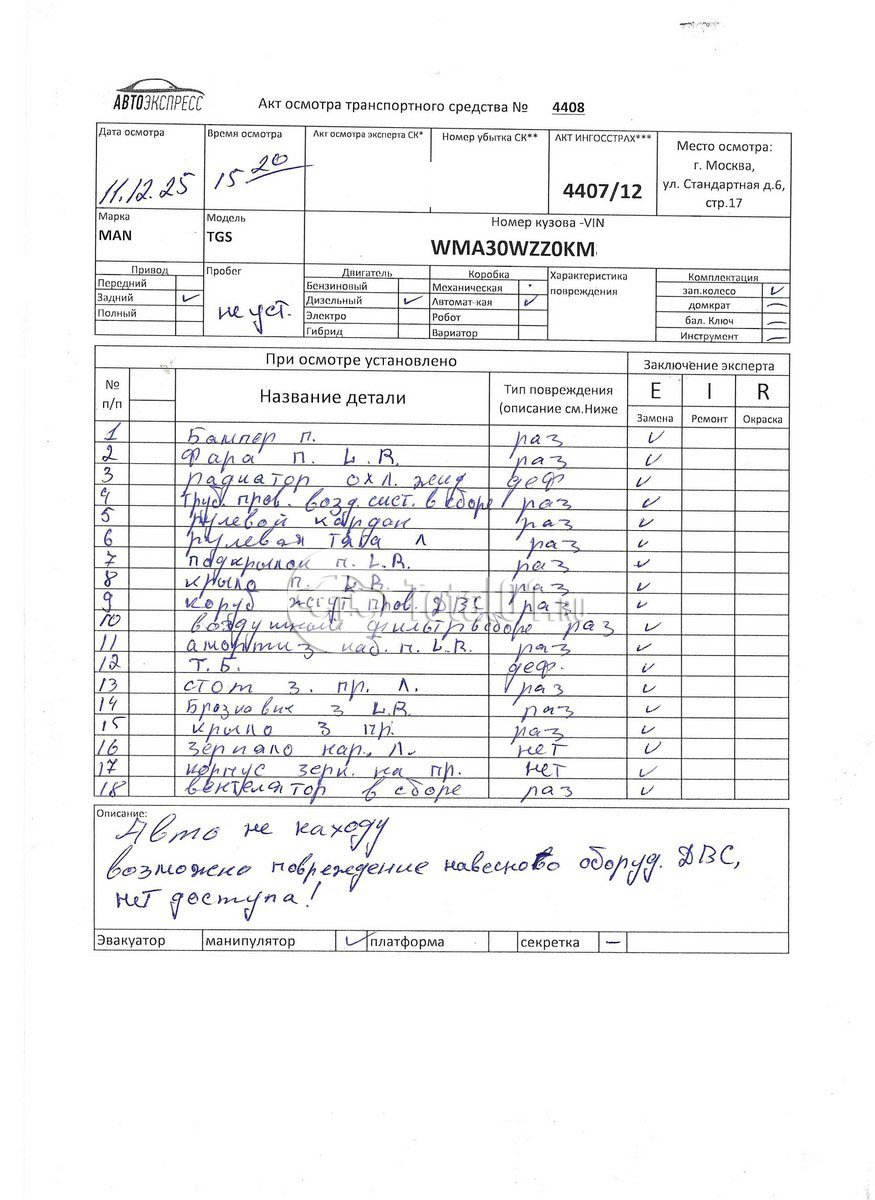 MAN TGS 33.440 6x4 BLS-WW. ПТС: Не передан (выдана справка). Вин номер предоставляется по запросу,направленному на адрес man4@total01.ru. Стоянка: ул.Стандартная, д.6, стр.17. Счет выставляется автомагазином ООО «Блицкар». (Сумма НДС будет указана в счет фактуре). Авто после ДТП, возможны скрытые повреждения. Гарантии юридической чистоты. Запчасти с авто отдельно не продаются. Цены по телефону не обсуждаются. ДКП и ПТС(если не изъят в ГИБДД) находятся в Москве. Возможности отправки документов нет. Для получения ДКП и ПТС(если не изъят в ГИБДД) потребуется ваше личное присутствие или нотариальная доверенность на вашего представителя. Левый передний удар; кабина; возможны скрытые повреждения. Ранее автомобиль находился в собственности юр.лица. Количество владельцев: н/у. Пробег н/у.