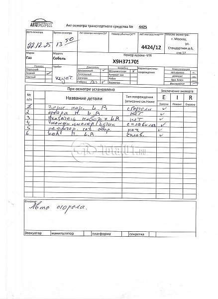 ГАЗ АФ-37170S Соболь. ПТС: Не передан (выдана справка). Вин номер предоставляется по запросу,направленному на адрес man4@total01.ru. Стоянка: ул.Стандартная, д.6, стр.17. Счет выставляется автомагазином ООО «Блицкар». (Сумма НДС будет указана в счет фактуре). Авто после ДТП, возможны скрытые повреждения. Гарантии юридической чистоты. Запчасти с авто отдельно не продаются. Цены по телефону не обсуждаются. ДКП и ПТС(если не изъят в ГИБДД) находятся в Москве. Возможности отправки документов нет. Для получения ДКП и ПТС(если не изъят в ГИБДД) потребуется ваше личное присутствие или нотариальная доверенность на вашего представителя. Пожар ДВС, кабины; возможны скрытые повреждения. Ранее автомобиль находился в собственности юр.лица. Количество владельцев: н/у. Пробег н/у.