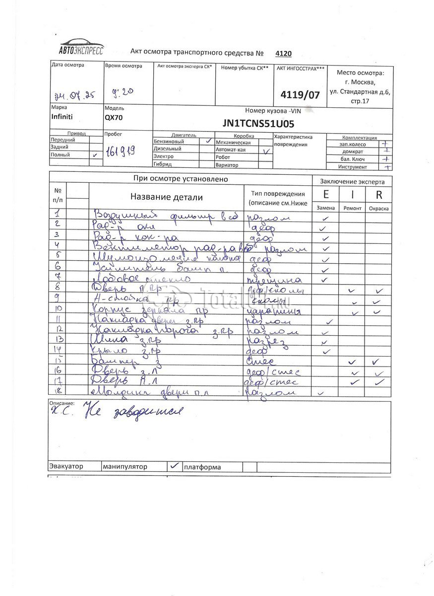 ПТС: Не передан (выдана справка). Вин номер предоставляется по запросу,направленному на адрес man4@total01.ru. Стоянка: ул.Стандартная, д.6, стр.17. Счет выставляется автомагазином ООО «Блицкар». (Сумма НДС будет указана в счет фактуре). Авто после ДТП, возможны скрытые повреждения. Гарантии юридической чистоты. Запчасти с авто отдельно не продаются. Цены по телефону не обсуждаются. ДКП и ПТС(если не изъят в ГИБДД) находятся в Москве. Возможности отправки документов нет. Для получения ДКП и ПТС(если не изъят в ГИБДД) потребуется ваше личное присутствие или нотариальная доверенность на вашего представителя. Правый передний удар; правый бок; возможны скрытые повреждения. Ранее автомобиль находился в собственности физ.лица. Количество владельцев: н/у.
