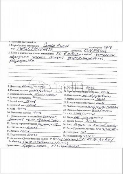 ПТС: Не передан (выдана справка). Вин предоставляется по запросу на почту manager01@total01.ru Стоянка: г. Сочи, ул. Просвещения, 139. Счет выставляется автомагазином ООО «Блицкар». (Сумма НДС будет указана в счет фактуре). Авто после ДТП, возможны скрытые повреждения. Гарантии юридической чистоты. Запчасти с авто отдельно не продаются. Цены по телефону не обсуждаются. ДКП и ПТС(если не изъят в ГИБДД) находятся в Москве. Возможности отправки документов нет. Для получения ДКП и ПТС(если не изъят в ГИБДД) потребуется ваше личное присутствие или нотариальная доверенность на вашего представителя. При получении транспортного средства в региональном филиале при себе иметь оригиналы: ДКП + ПТС (если не изъят в ГИБДД) + Нотариальная доверенность (если автомобиль получает представитель, или на бланке организации с печатью при оплате юр. лицом). Ранее автомобиль находился в собственности юр. лица. Пробег н/у. Кол-во владельцев: н/у. Передний удар; возможны скрытые повреждения.