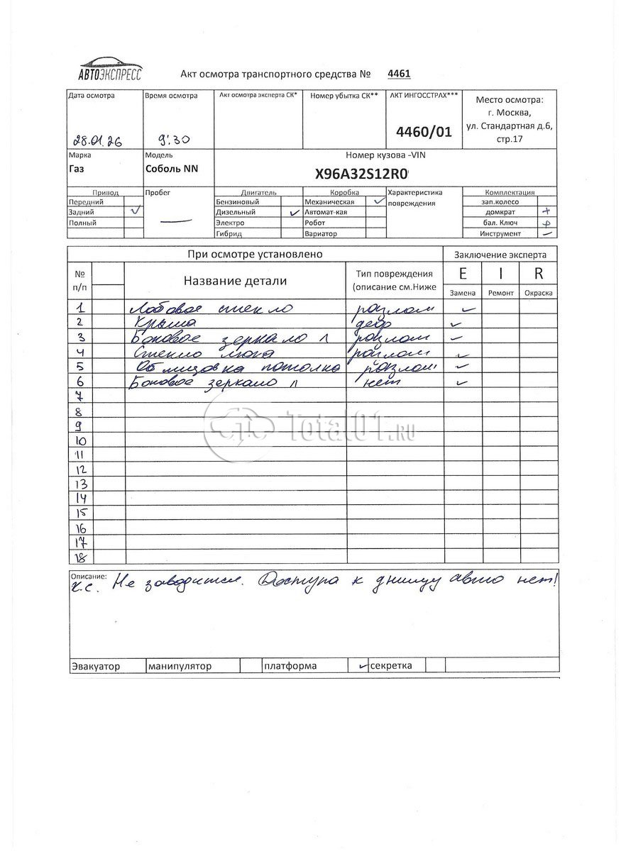 Газ Соболь NN. ПТС: Не передан (выдана справка). Вин номер предоставляется по запросу,направленному на адрес man4@total01.ru. Стоянка: ул.Стандартная, д.6, стр.17. Счет выставляется автомагазином ООО «Блицкар». (Сумма НДС будет указана в счет фактуре). Авто после ДТП, возможны скрытые повреждения. Гарантии юридической чистоты. Запчасти с авто отдельно не продаются. Цены по телефону не обсуждаются. ДКП и ПТС(если не изъят в ГИБДД) находятся в Москве. Возможности отправки документов нет. Для получения ДКП и ПТС(если не изъят в ГИБДД) потребуется ваше личное присутствие или нотариальная доверенность на вашего представителя. Левый бок; правый бок; крыша; возможны скрытые повреждения. Ранее автомобиль находился в собственности физ.лица. Количество владельцев: н/у. Пробег н/у.