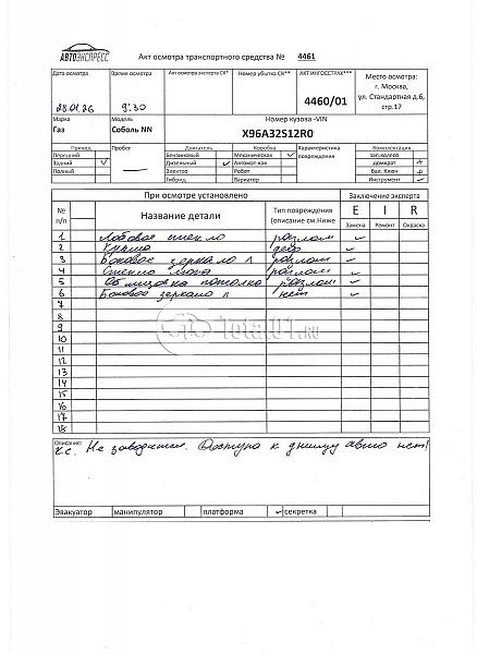 Газ Соболь NN. ПТС: Не передан (выдана справка). Вин номер предоставляется по запросу,направленному на адрес man4@total01.ru. Стоянка: ул.Стандартная, д.6, стр.17. Счет выставляется автомагазином ООО «Блицкар». (Сумма НДС будет указана в счет фактуре). Авто после ДТП, возможны скрытые повреждения. Гарантии юридической чистоты. Запчасти с авто отдельно не продаются. Цены по телефону не обсуждаются. ДКП и ПТС(если не изъят в ГИБДД) находятся в Москве. Возможности отправки документов нет. Для получения ДКП и ПТС(если не изъят в ГИБДД) потребуется ваше личное присутствие или нотариальная доверенность на вашего представителя. Левый бок; правый бок; крыша; возможны скрытые повреждения. Ранее автомобиль находился в собственности физ.лица. Количество владельцев: н/у. Пробег н/у.