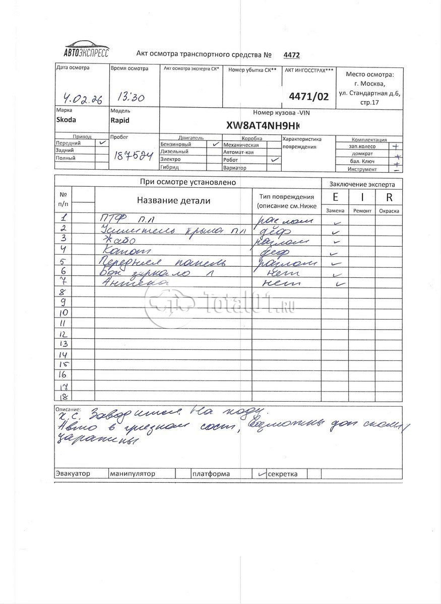 ПТС: Не передан (выдана справка). Вин номер предоставляется по запросу,направленному на адрес man4@total01.ru. Стоянка: ул.Стандартная, д.6, стр.17. Счет выставляется автомагазином ООО «Блицкар». (Сумма НДС будет указана в счет фактуре). Авто после ДТП, возможны скрытые повреждения. Гарантии юридической чистоты. Запчасти с авто отдельно не продаются. Цены по телефону не обсуждаются. ДКП и ПТС(если не изъят в ГИБДД) находятся в Москве. Возможности отправки документов нет. Для получения ДКП и ПТС(если не изъят в ГИБДД) потребуется ваше личное присутствие или нотариальная доверенность на вашего представителя. Левый передний удар; возможны скрытые повреждения. Ранее автомобиль находился в собственности физ.лица. Количество владельцев: н/у.
