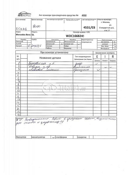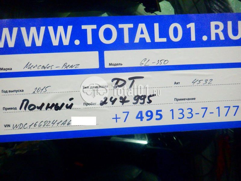Mercedes-Benz GL 350 4 Matic. ПТС: Не передан (выдана справка). Вин номер предоставляется по запросу,направленному на адрес man4@total01.ru. Стоянка: ул.Стандартная, д.6, стр.17. Счет выставляется автомагазином ООО «Блицкар». (Сумма НДС будет указана в счет фактуре). Авто после ДТП, возможны скрытые повреждения. Гарантии юридической чистоты. Запчасти с авто отдельно не продаются. Цены по телефону не обсуждаются. ДКП и ПТС(если не изъят в ГИБДД) находятся в Москве. Возможности отправки документов нет. Для получения ДКП и ПТС(если не изъят в ГИБДД) потребуется ваше личное присутствие или нотариальная доверенность на вашего представителя. Левый бок; возможны скрытые повреждения. Ранее автомобиль находился в собственности физ.лица. Количество владельцев: н/у.