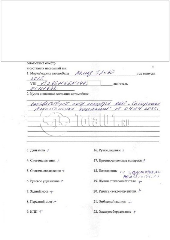 ПТС: Не передан (выдана справка). Вин предоставляется по запросу на почту manager01@total01.ru Стоянка: г. Томск, ул. Угрюмова, 8, стр.2. Счет выставляется автомагазином ООО «Блицкар». (Сумма НДС будет указана в счет фактуре). Авто после ДТП, возможны скрытые повреждения. Гарантии юридической чистоты. Запчасти с авто отдельно не продаются. Цены по телефону не обсуждаются. ДКП и ПТС(если не изъят в ГИБДД) находятся в Москве. Возможности отправки документов нет. Для получения ДКП и ПТС(если не изъят в ГИБДД) потребуется ваше личное присутствие или нотариальная доверенность на вашего представителя. При получении транспортного средства в региональном филиале при себе иметь оригиналы: ДКП + ПТС (если не изъят в ГИБДД) + Нотариальная доверенность (если автомобиль получает представитель, или на бланке организации с печатью при оплате юр. лицом). Ранее автомобиль находился в собственности юр. лица. Пробег н/у. Кол-во владельцев: н/у. Передний удар; кабина; рама; возможны скрытые повреждения.