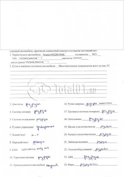 ПТС: Не передан (выдана справка). Вин предоставляется по запросу на почту manager01@total01.ru Стоянка: г. Челябинск, г.Еманжелинск, ул.Курчатова, д.2. Счет выставляется автомагазином ООО «Блицкар». (Сумма НДС будет указана в счет фактуре). Авто после ДТП, возможны скрытые повреждения. Гарантии юридической чистоты. Запчасти с авто отдельно не продаются. Цены по телефону не обсуждаются. ДКП и ПТС(если не изъят в ГИБДД) находятся в Москве. Возможности отправки документов нет. Для получения ДКП и ПТС(если не изъят в ГИБДД) потребуется ваше личное присутствие или нотариальная доверенность на вашего представителя. При получении транспортного средства в региональном филиале при себе иметь оригиналы: ДКП + ПТС (если не изъят в ГИБДД) + Нотариальная доверенность (если автомобиль получает представитель, или на бланке организации с печатью при оплате юр. лицом). Ранее автомобиль находился в собственности юр. лица. Пробег н/у. Кол-во владельцев: н/у. Передний удар; кабина; возможны скрытые повреждения. ТС снято с учета в связи с утилизацией, гибелью или уничтожением